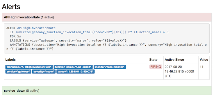$ watch'docker service ls'ID NAME MODE REPLICAS IMAGE PORTS57ine9c10xhp func_wordcount replicated 1/1 functions/alpine:latest-armhfd979zipx1gld func_prometheus replicated 1/1 alexellis2/prometheus-armhf:1.5.2*:9090->9090/tcpf9yvm0dddn47 func_echoit replicated 1/1 functions/alpine:latest-armhflhbk1fc2lobq func_markdown replicated 1/1 functions/markdownrender:latest-armhfpj814yluzyyo func_alertmanager replicated 1/1 alexellis2/alertmanager-armhf:0.5.1*:9093->9093/tcpq4bet4xs10pk func_gateway replicated 1/1 functions/gateway-armhf:0.6.0*:8080->8080/tcpv9vsvx73pszz func_nodeinfo replicated 1/1 functions/nodeinfo:latest-armhf